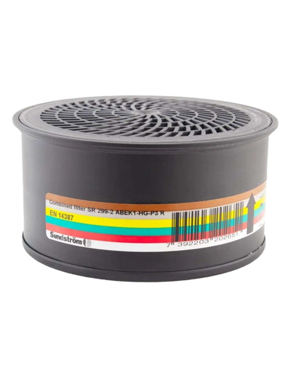 Filtrul multi-gaz Sundstrom SR 299-2 ABEK1-Hg-P3 R este un filtru combinat avansat si versatil, format dintr-un filtru multi-gaz ABEK1, un filtru de particule P3 de inalta clasa si un filtru de vapori de mercur. Conceput pentru utilizare cu masti respiratorii Sundström cu fata completa si semi-masca. Filtrul SR 299-2 are un timp de functionare maxim combinat de 50 de ore de functionare.