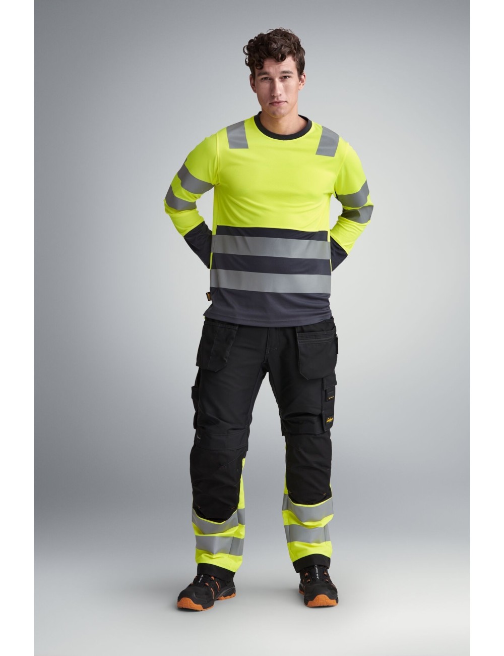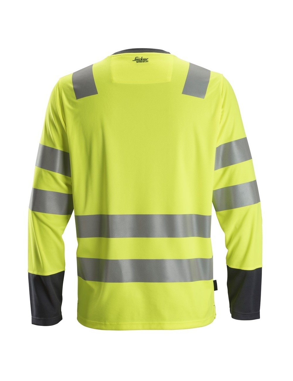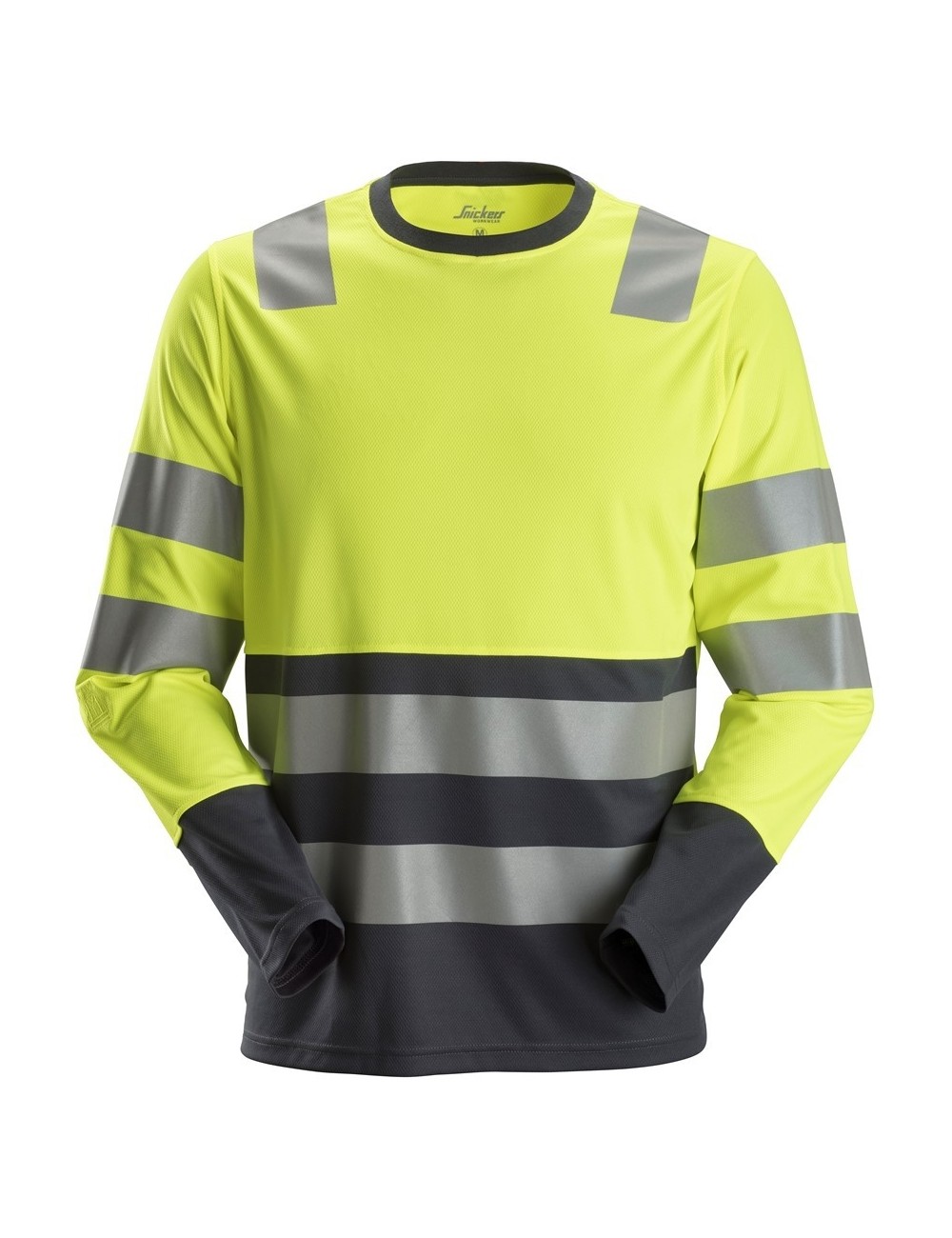 Longsleeve Snickers 2433 AllroundWork to wykonany z wysokiej jakości materiałów, profesjonalny longsleeve do pracy w warunkach kiepskiej widoczności. Wykonany w 100% z poliestru zapewnia dobrą wentylacje i odprowadzanie wilgoci. Może służyć zarówno jako podstawowa odzież noszona zamiast kamizelki odblaskowej jak i jako pierwsza warstwa noszona pod softshell czy kamizelkę ocieplaną w chłodniejsze dni. Wykorzystanie nowoczesnych technologii w produkcji tego produktu gwarantuje, że będziesz czuć się komfortowo nawet podczas intensywnej pracy w lecie, ale też skorzystasz z dobrych właściwości oddychających nosząc ten longsleeve zimą pod odzieżą wierzchnią. Producent zastosował w nim kontrastowe materiały i pasy odblaskowe dla poprawy widocznośc. Podczas projektowania pomyślano również o ciężko pracujących profesjonalistach. Dlatego też w koszulce zastosowano ciemniejszy materiał w strefach narażonych na zabrudzenia.