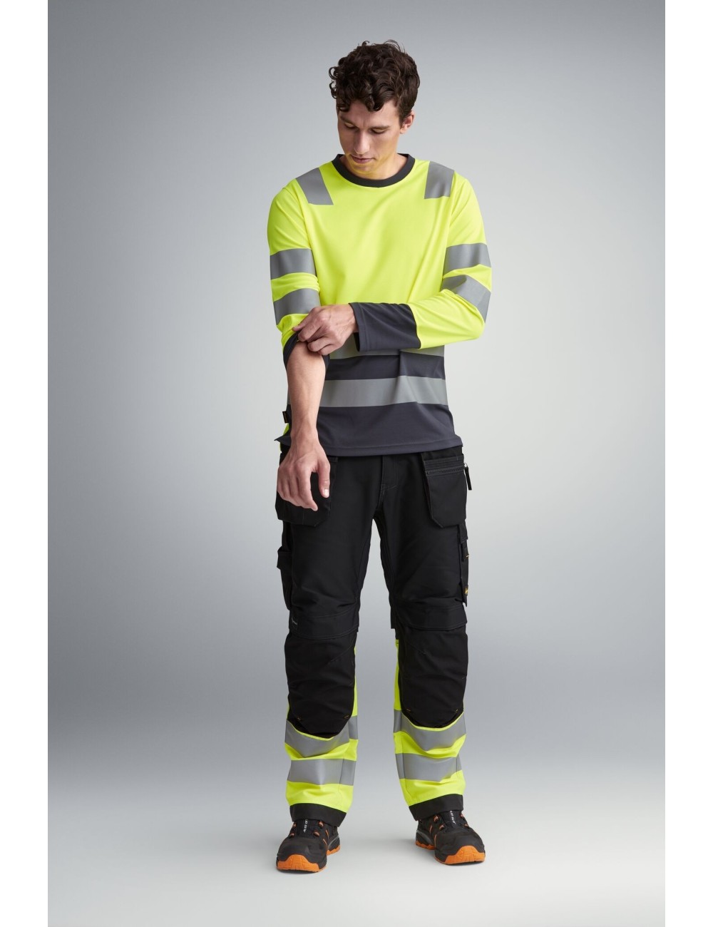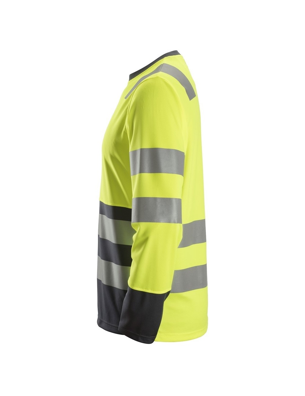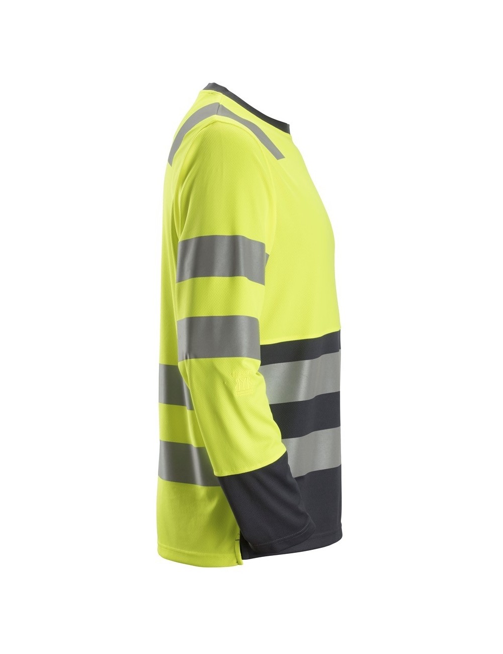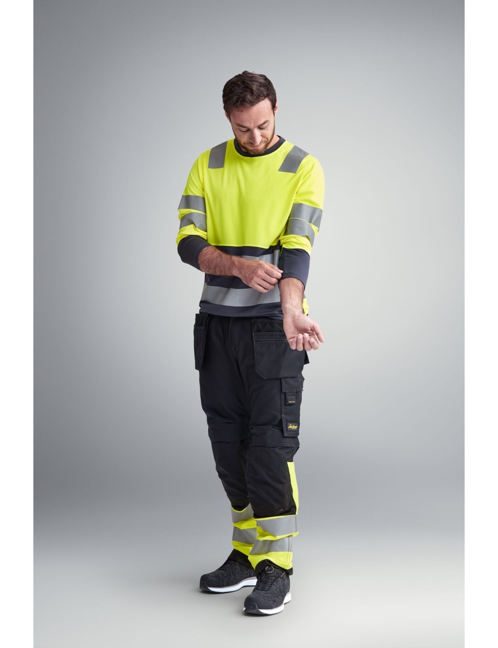 Longsleeve Snickers 2433 AllroundWork to wykonany z wysokiej jakości materiałów, profesjonalny longsleeve do pracy w warunkach kiepskiej widoczności. Wykonany w 100% z poliestru zapewnia dobrą wentylacje i odprowadzanie wilgoci. Może służyć zarówno jako podstawowa odzież noszona zamiast kamizelki odblaskowej jak i jako pierwsza warstwa noszona pod softshell czy kamizelkę ocieplaną w chłodniejsze dni. Wykorzystanie nowoczesnych technologii w produkcji tego produktu gwarantuje, że będziesz czuć się komfortowo nawet podczas intensywnej pracy w lecie, ale też skorzystasz z dobrych właściwości oddychających nosząc ten longsleeve zimą pod odzieżą wierzchnią. Producent zastosował w nim kontrastowe materiały i pasy odblaskowe dla poprawy widocznośc. Podczas projektowania pomyślano również o ciężko pracujących profesjonalistach. Dlatego też w koszulce zastosowano ciemniejszy materiał w strefach narażonych na zabrudzenia.