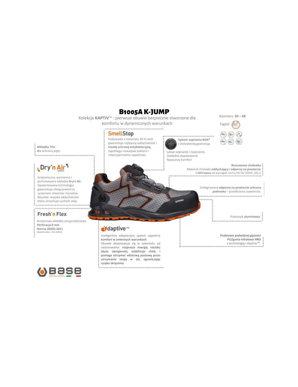 Pantofi de lucru BASE K-JUMP S1P sunt pantofi de lucru moderni din cea mai recenta colectie KAPTIV, caracterizati printr-o combinatie indrazneata de culori care atrage atentia si, mai presus de toate, prin utilizarea celor mai noi tehnologii pentru a spori confortul. Modelul BASE K-JUMP S1P are un aspect dinamic de pantof sport si este, de asemenea, perfect pentru purtarea zilnica. Un varf din aluminiu reduce greutatea pantofului si subtiaza si mai mult silueta. Pentru un confort sporit, talpa este realizata folosind tehnologia I-daptive , care ajusteaza distributia greutatii purtatorului pentru o amortizare mai buna si o oboseala redusa a piciorului. Captuseala antibacteriana Smell Stop si un brant Dry 'nAir special construit permit circulatia continua a aerului in interiorul pantofului, imbunatatind confortul si respirabilitatea.