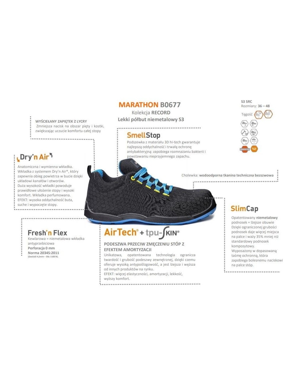Pantofi de lucru BASE Marathon sunt cel mai recent model din seria Record, care se mandresc cu un confort excelent. Amortizarea excelenta va va oferi o senzatie de confort la picioare, mai ales atunci cand petreceti multe ore in picioare. Brantul interior gros, perforat, ofera o amortizare adecvata si elimina umezeala de la talpa pentru a va mentine picioarele uscate si confortabile. Clasa de protectie S3 ofera protectie completa a piciorului impotriva pericolelor mecanice. Un varf compozit protejeaza degetele de la picioare, iar o brant anti-perforatie va protejeaza piciorul in cazul in care calcati pe un cui sau alt obiect ascutit. Culorile indraznete si designul modern al modelului Marathon fac din acest model o alegere excelenta nu numai pe santierele de constructii sau in depozite, ci si la birou. Modelul Base Marathon este o alegere populara nu numai ca pantof de lucru, ci si pentru manageri, ingineri si angajati.