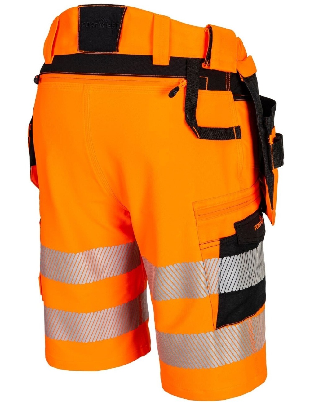 Spodenki odblaskowe elastyczne Portwest DX446 wykonane z elastycznego materiału stretch 4X zapewniają komfort termiczny, pełną wygodę i swobodę ruchów oraz bezpieczeństwo w warunkach ograniczonej widoczności. Lekki i rozciągający się materiał główny pozwala swobodnie zmieniać pozycje podczas pracy, wchodzić po drabinie, kucać, klękać. Spodenki DX446 to również masa praktycznych kieszeni, w tym odpinane worki kieszeniowe by wszystkie niezbędne narzędzia i wyposażenie trzymać pod ręką. Ostrzegawczy, jaskrawy kolor w połączeniu z certyfikowanymi segmentowymi taśmami odblaskowymi gwarantują bezpieczeństwo podczas pracy.