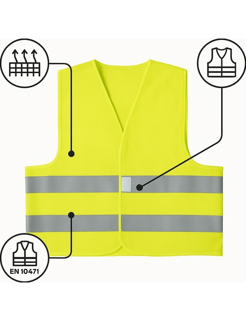 Vesta este confectionata din material tip plasa 100% poliester cu o greutate de 120 g/m², ceea ce asigura usurinta si respirabilitate.